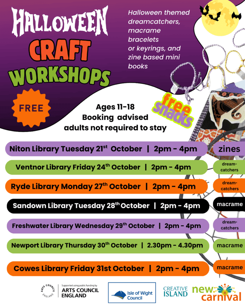 This project aims to collaboratively explore the opportunities and challenges libraries face when hosting literary, performance, and workshop events, and build relationships with the islands wider cultural sector. It will involve libraries across the Island – in Newport, Cowes, Ryde, Sandown, Ventnor, and Freshwater – and explore possibilities with the five volunteer-led libraries in Bembridge, East Cowes, Brighstone, Niton, and Shanklin.